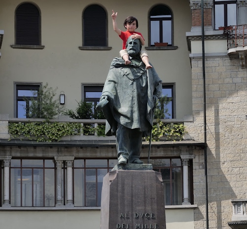 Quest'opera di Maurizio Cattelan a Bergamo creato un sacco di casini....con questo autore non esistono compromessi! Il problema è che questa statua si trova su una rotonada molto trafficata, e molti automobilisti hanno rischiato incidenti e più di uno ha chiamato le forze dell'ordine per segnalare un bambino sulla statua di Garibaldi. Bergamo non è abituata a queste cose, ci sono state parecchie polemiche! |