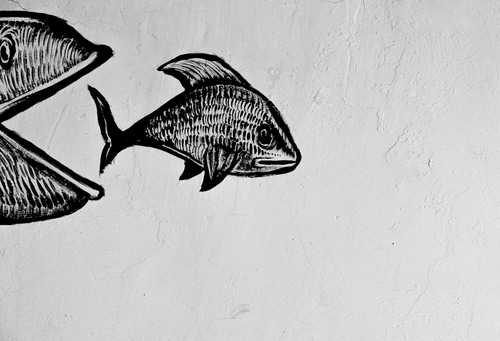Altri tag (senza riscontro): murale, nero, mangia, coda, mangiare, occhio, due, muro, inseguimento, dipinto, predatore, pesciolino, squame, bianco.