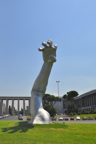 Tag: mano, verde, braccio, erba, prato, cielo, monumento, alberi, dita, scultura, colonne, automobili, strada, azzurro, argento, statua, palazzi, lampione.